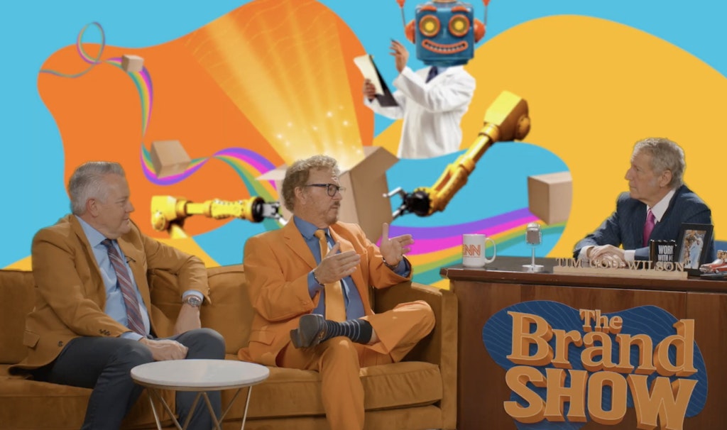 We launched Dudley and the rest of the internal campaign during an all-company meeting in January of 2024, after previously releasing an internal teaser campaign. The meeting started the same as many had in the past: Ernest’s CEO, Tim Wilson, speaking from a conference room on Zoom to all 14 division offices. Then, the meeting took a turn and Tim was magically captured into TV land and onto a talk show set for The Brand Show to unveil the new brand and future go-to-market activities. The set was reminiscent of late-night shows like David Letterman and Johnny Carson, with a live audience adding energy to the atmosphere. Tim, Brian Porter the EVP of Client Relations, and Scott Gardner, Liquid CEO and Ernest CMO donning an orange suit, were involved in a playful and informative interview about the new brand, with other Ernest leaders and key E-Teamers coming in to play brand-related games and appear in fun features.